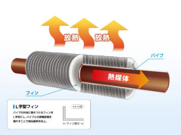 同社の「LSフィンチューブ」は、金属の伝熱管にアルミ薄板をスパイラル状に圧着・加工して製造する。伝熱管の配列や間隔を自由に設計できるエロフィン、伝熱面積を広くとれるプレートフィン双方の利点を持ち合わせており、フィンと一体構造の放熱管と同等の伝熱効率を有する。また、フィン形状にはダストの付着を低減するフラットフィンを採用している。最短1週間、製作本数1本から対応できるのが特徴だ。